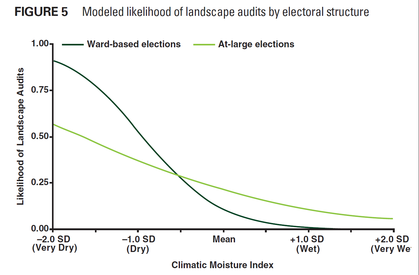 This article analyzes the influence of local governmental structures on the likelihood that utilities adopt one of two water conservation policies: conservation rates and landscape audits. Statistical analysis tests the effects of special-district versus general-purpose-structures, ward-based versus at-large electoral structures, and mayor-council versus council-manager charter forms.
