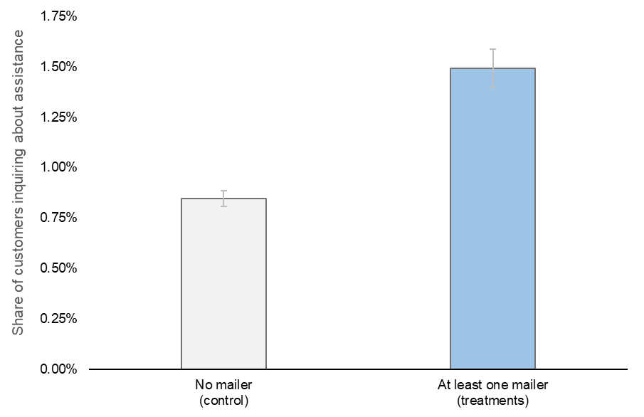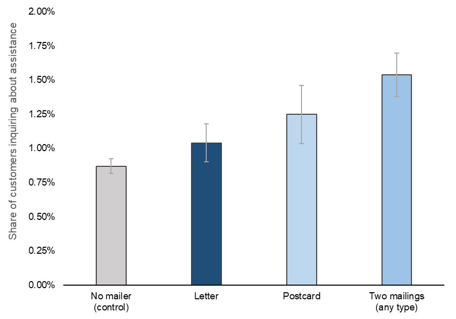 NEORSD customer service staff logged all contacts in which customers inquired about assistance programs. We linked those inquiries to treatment and control group records, then used statistical analysis to figure out whether our mailings caused increased CAP inquiries and how different mailing characteristics affected the likelihood of CAP inquiries.